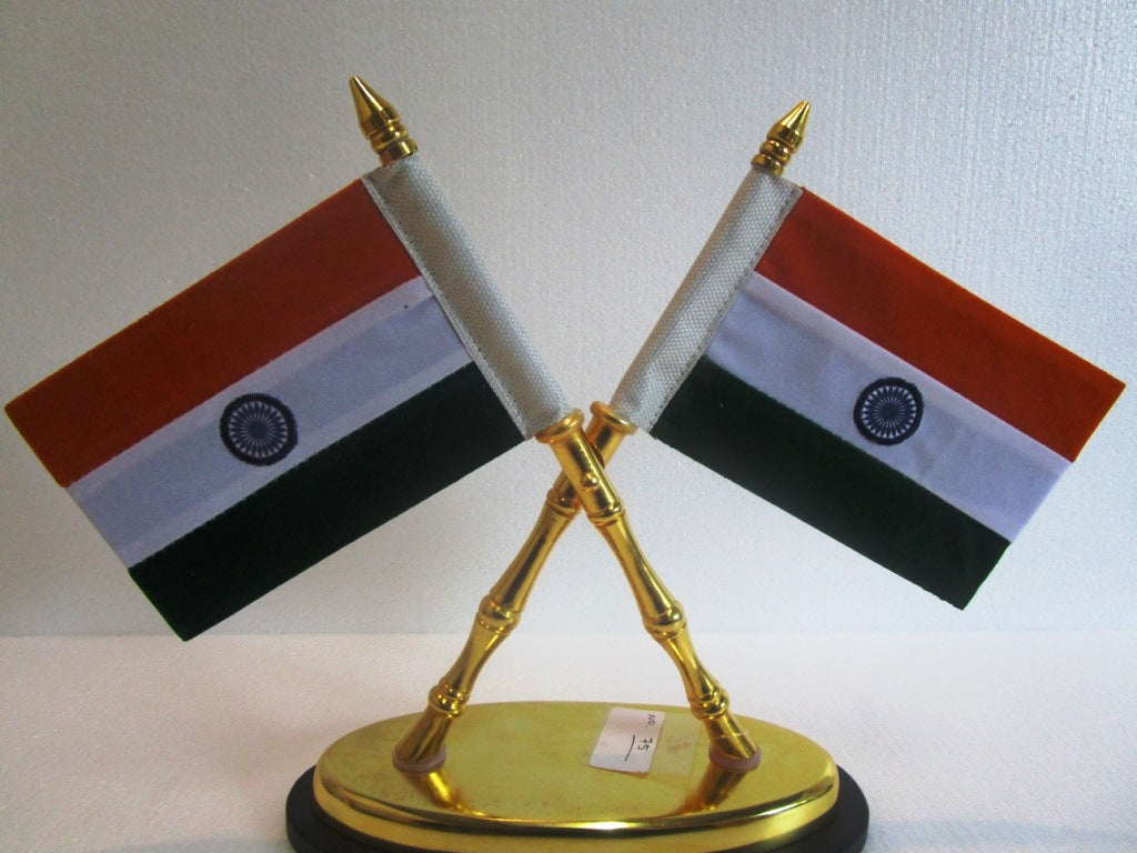India National FLAG Memento Sculpture Home Office Desk Artwork Showpiece Rare (75) - Aluminium Made with Fabric Flags and Wooden Base - Weight: Approx. 0.615 Kgs - Size: Approx. 11.75 X 9.75 Inches - Unique Collection from Brass Blessing